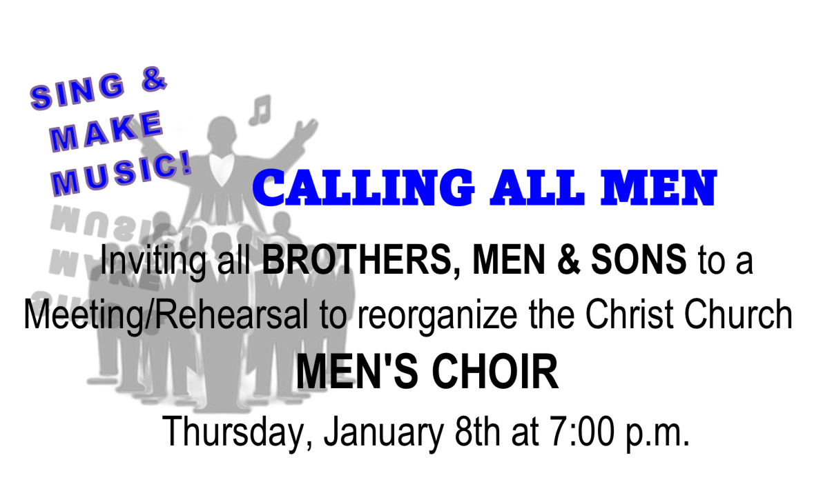 MEN’S CHOIR rehearsal will begin this week Thursday at 7:00 p.m. in the main church under the direction of Bro. Anthony Wolffe, a well known retired music teacher and choral director.