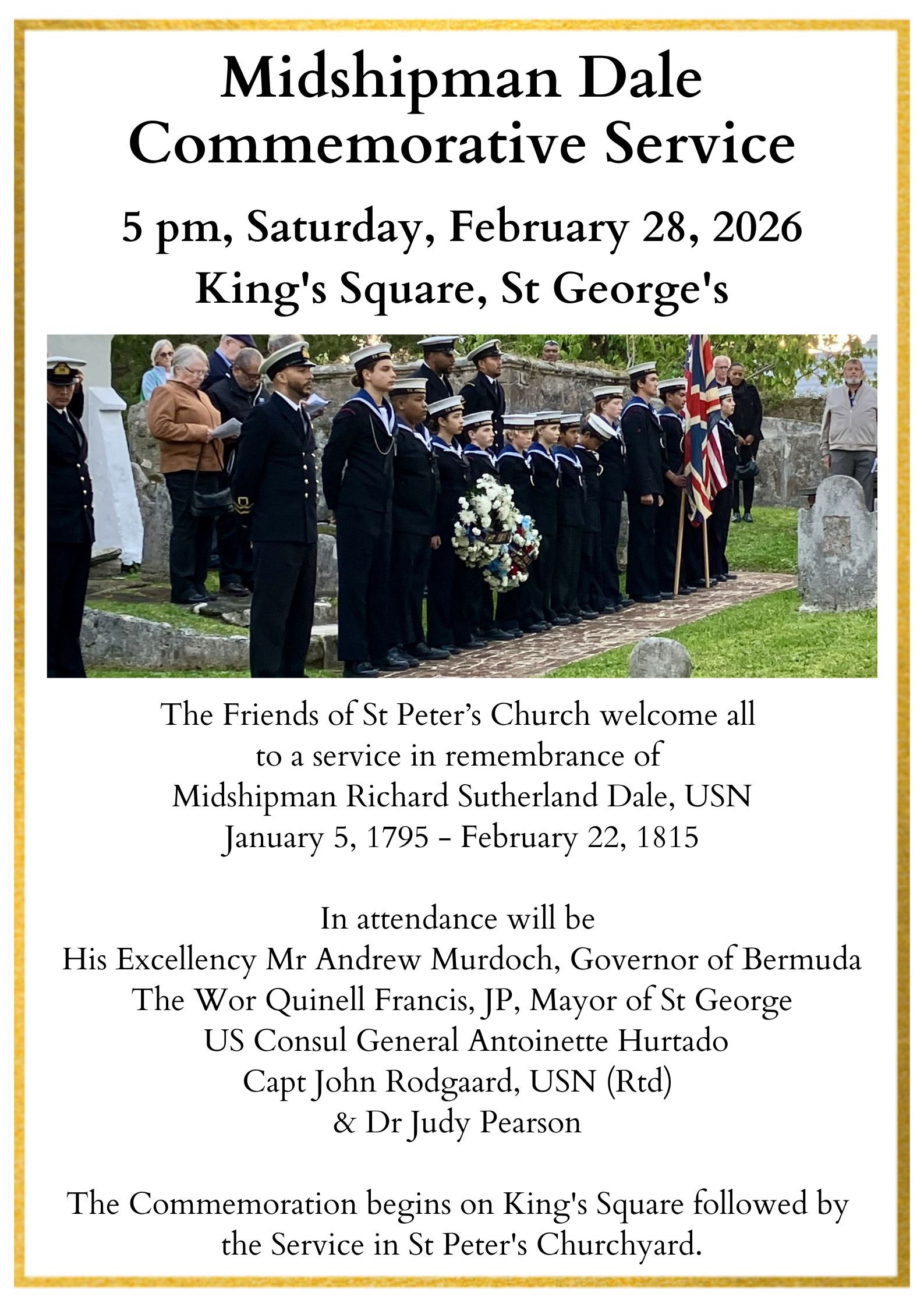 The Annual Commemorative Service of the death of Midshipman Richard Sutherland Dale, USN, January 5th, 1795 – February 22nd, 1815, takes place in King’s Square, St. George’s on Saturday, February 28th, 2026 at 5:00 p.m, followed by the laying of wreaths at his grave in St. Peter’s Church graveyard.
