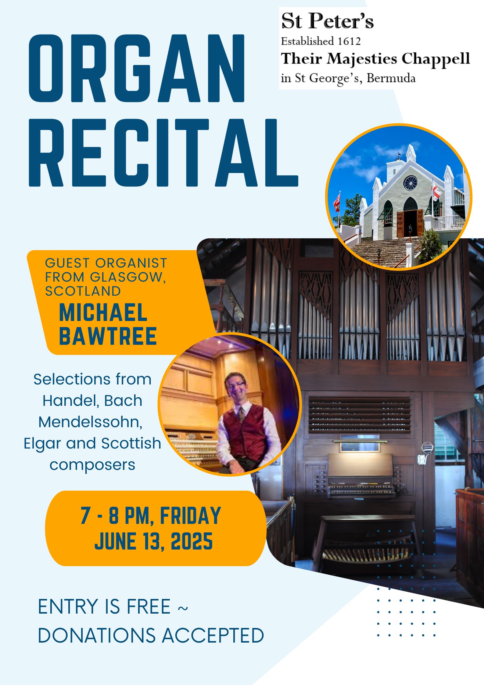 Organist Michael Bawtree will be visiting Bermuda from Scotland for the first time in almost 30 years and is delighted to give a concert in St George’s. The hour-long concert takes place on Friday, June 13th, at 7 pm, and will include music by Handel, Bach, Elgar, Mendelssohn and Scottish composers. Admission is free and donations will go to St Peter’s Church, Their Majesties Chappell